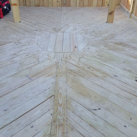 This beautiful deck is defined by its radiating, sunburst-patterned center, drawing the eye outward to the custom-detailed pergola overhead. Integrated benches are flanked by built-in flower boxes, creating a cohesive, living-space feel. The entire surface features artfully angled deck boards that add visual movement and define the space.